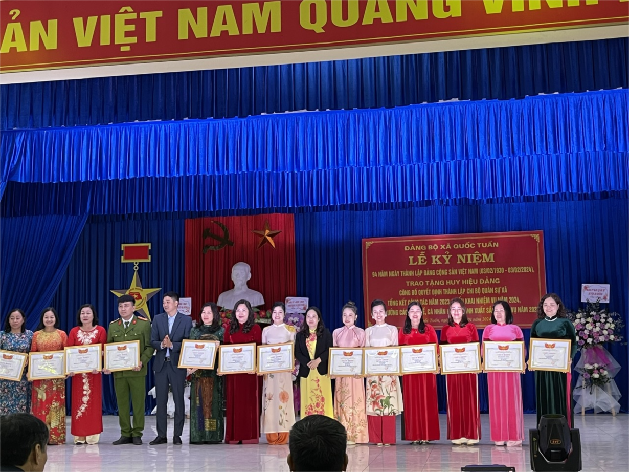 Sáng ngày 22/01/2024, Đảng ủy xã Quốc Tuấn tổng kết công tác năm 2023; triển khai nhiệm vụ và phát động phong trào thi đua năm 2024; trao tặng huy hiệu Đảng; công bố quyết định thành lập chi bộ quân sự xã. Tại hội nghị Đảng ủy đã trao thưởng cho các tập thể và các cá nhân có thành tích xuất sắc trong công tác Đảng năm 2023. Chi bộ trường mầm non Quốc Tuấn rất vinh dự đạt danh hiệu "Chị bộ hoàn thành xuất sắc nhiệm vụ" năm 2023 và các đồng chí Đảng viên Trường mầm non Quốc Tuấn qua một năm phấn đấu 06 đ/c đã được khen thưởng hoàn thành xuất sắc nhiệm vụ có các đồng chí sau:
